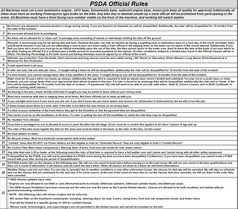 Time slips must be signed by an official to qualify. A PSDA board member can appoint an official to check fuel and sign tickets. All fuel tests will be conducted randomly and will be subject to visual inspection of the fuel system. Top qualifiers may get tested either before or after their run. There must be enough fuel in the tank to make an adequate test and run down the track. After a pass has been made for either a record attempt or 1st/2nd place the bike HAS to stop at the tech booth for fuel inspection.
